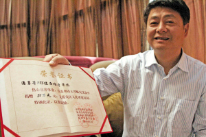 潘勇展示去年“桑美”台风后西班牙华侨捐赠证书。 苏巧将 摄