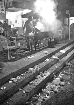 ▲夜排档前不但浓烟滚滚而且垃圾遍地。赵用 摄