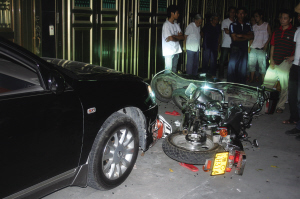 昨晚6时40分,乐清市虹桥镇龙坛移民村内的一条巷子里,突然来了这位“不速之客”,当时村民周某与一位孕妇、一小女孩和一位老大妈相继被撞倒在地,之后,车子没有减速,发疯一般,左突右撞,一会儿撞上住房大门,一会儿撞上下水管道,最后撞倒四辆并排停放的摩托车和电瓶车后,才停下来了。村民周某说,司机是个男的,穿着件白色的衣服,瘦瘦的,车一停下,就打开车门跑了,连看都没看一下地上的人。住户金先生说,这么小的巷子,这么多人,真不知道这车子为何开这么快。