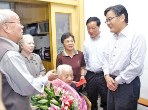 “老人家您好,祝您老健康长寿。”昨天下午,市领导邵占维、黄德康、葛益平一行,首先来到龙湾区永中街道百岁老人黄阿英家中。刚一进门,邵占维就赶紧走上前握住老人的手,并送上一束鲜花,向她表示亲切的问候和祝福。黄阿英1908年出生,现在已经五代同堂。邵占维弯下身子,耐心地询问了老人的日常饮食起居。“平时胃口好么?”当听说“老人能吃能睡,精神也很好”后,邵占维十分高兴,并嘱咐其家人要好好照顾老人,让老人安享晚年。家住永中街道永宁西路的朱秀标老人曾经是种粮大户,在上个世纪70年代被评为市级劳模。“老人家日子过得好么?”一见面,邵占维就紧紧握住朱秀标的手,关切地问道。“好,好,好,一切都好。”老人高兴地答道。随后,老人拿出了一直珍藏着的劳模奖章和先进工作者的证书,尽管奖章和证书都有些褪色,但老人的脸上满是自豪和荣耀。告别朱秀标,邵占维一行又来到永中街道困难老人林永甫家中,因为年老多病,家中又缺少劳动力,老两口生活困难,一直靠低保过日子。递上鲜花,促膝而谈,邵占维关切地问老人:“生活上有没有遇到什么困难?”市领导的这份关爱让老人感动,老人说:“现在村里每个月都会补助我们几百元,一些保险也帮我们保起来了,日子慢慢会好起来的。”临别时,邵占维一再叮嘱当地街道和社区干部,要切实关心林永甫老人一家的生活,尽可能地提供帮助,让他们安享晚年。