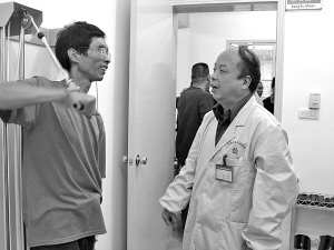 ▲昨天下午,广化街道残疾人康复指导站里,居民曾长华正在康复师的指导下,在“复式增拉力器”上完成四肢大肌肉的康复运动。 朱珊超 摄