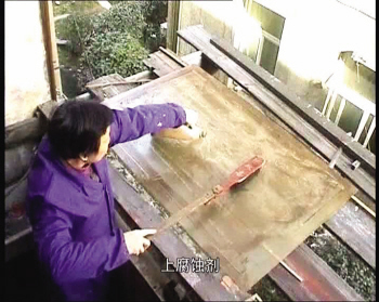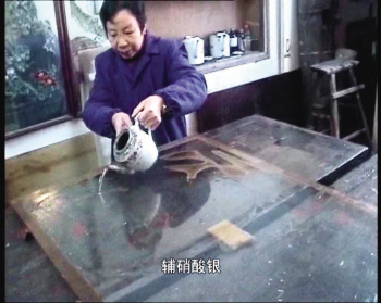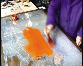 项月华一边领着记者参观工作室,一边介绍着玻璃银光刻的每个步骤:首先要给玻璃的一面上蜡,然后将玻璃和打好的图案底稿重叠,用刻刀通过玻璃上显现的纹路进行雕刻。刻好基本线条后,再将特殊的药水倒入玻璃中的线条缝隙进行腐蚀。一定时间后,将其洗净、刮去蜡层,玻璃上便会显现出清晰的线条。接着,就是镀银、敷红丹、刮银层、上色等几道工序。因为是在玻璃背面作画,所以“上色”可不简单。记者在一块半成品的玻璃反面,只看到一团团深深浅浅的颜料,可是将玻璃转到正面时,一个光彩照人的人物形象就出现了,甚至可以看出细腻的色彩渐变过程。