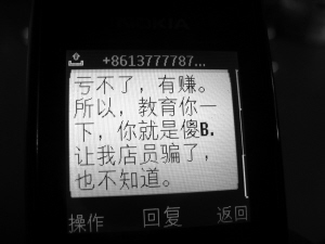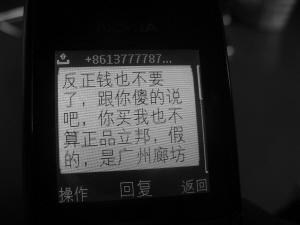 10月23日晚,李女士收到了一条短信。“短信里不仅说卖给我的立邦油漆是假货,不是上海生产的立邦油漆,还骂我是傻X,当时我气坏了,哪有这样做生意的,不过我懒得理他。”李女士翻开手机,给记者看了这条辱骂她的短信以及之后一系列的短信,其中还包括自称是立邦油漆售后的工作人员给李女士的道歉短信,以及一条要求李女士将油漆款汇到银行账号的短信。