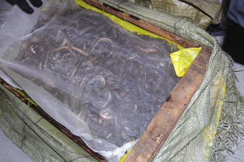 前晚9点25分许,甬台温高速公路浙闽收费站春运服务站,一辆从温州开往广州市的大客车停靠接受检查。高速交警缪警官对该车行李箱检查时发现一个包有塑料袋的箱子,这引起他的注意。“2008年12月1日,我在类似包装箱内查获过1000多条蛇。我要求驾驶员将这个箱子搬出行李箱。”缪警官说,尽管有准备但他还是被里面的物品吓了一跳,里面果然是蛇。