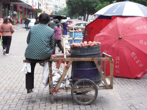 在温州火车站附近,记者碰到一卖烤红薯的,锈迹斑斑的烤箱盖上排了一圈的红薯,记者翻开烤箱中间的小盖子,只见里面就一个煤球炉,排成一圈的红薯直接就放在铁丝网上烤,整个烤箱内充满着煤气味。“这东西能吃吗,煤气味这么重。”记者问道,小贩连说没有关系——煤气进不了红薯里面,红薯一烤熟就拿出来了。小贩说,这烤箱的铁桶是小贩花了80元从一废品收购站买的,他自己也不知道这桶以前是装什么的,只要能做烤箱就可以了。