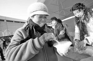 ▲昨天,回家的人们在温州火车站吃上了热粥。当天,“2009春运关爱行动”启动。 陈翔 摄