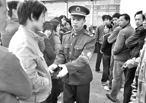 ▲昨天,温州军分区派出11名官兵到市区双屿客运中心维护秩序,并提供便民服务。 卢春雨 摄