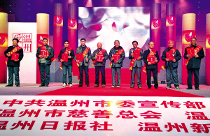 晚会颁出了温州改革开放30年的“十大慈善家”和“十大慈善人物”。当王振滔、邱光和、项光达、余碎斌等这些民众早已熟悉或依然有些陌生的获奖者相继走上台来的时候,当电视短片中依次播放他们的慈善经历的时候,许多观众第一次如此全面地看到了这些企业家的另一面。市民王蓓莹女士颇有感触地说:“原来他们不仅为个人和社会积累着物质财富,同样在创造着慈善这一宝贵的精神财富。”这些获奖者,是昨晚最大的明星。