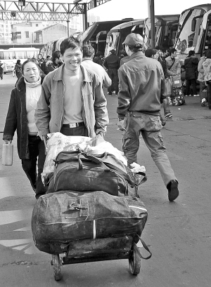 要回家了,在牛山北路客运中心,推着满车行李的旅客满脸绽放着开心的笑容。 陈翔 摄