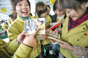 ▲“这个是你,那个是我,我们都上了明信片!”康奈员工陆文英(左)指着明信片上的自己和工友们分享喜悦。 赵用 摄