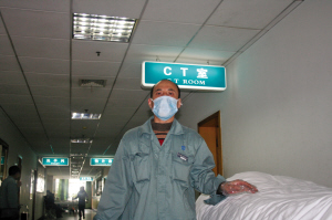 医院急诊室的担架工,一般都是工作一天,休息一天,白班从早上7点到下午5点,晚班从下午5点到第二天早上7点,24小时都得有人上班。由于他今年没回家,从大年三十开始到正月初三,钟师傅都在加班。初三晚上上夜班后,初四他休息了一天,初五开始正式上班。昨天是钟师傅上班的日子。他说,春节期间,来急诊的病人中车祸、火灾占的比率较大,内科的有高血压、胃出血等等,有时忙的话,一个班忙下来,经他手的病人至少有10来个,除了接急诊病人外,还要送病人去住院部。正说着,一位护士通知钟师傅把在急诊室的病人移到推车上,送CT室拍片。“一、二、三”钟师傅边抱着病人边喊口令,边在病人家属的配合下,把病人从病床移到推车上,然后直往CT室推。