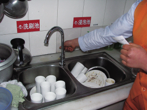 记者从黄先生家出来后,来到3幢一家奶吧。营业员指着水槽里大量未清洗的碗碟告诉记者,他们下午的时候被停了水,这给他们的生意造成很大的影响,不仅餐具没办法清洗,卫生也没办法清理,面包、茶叶蛋等也没有水蒸,如今,他们只能到其他小区去借点水。工作人员说,也不知道什么时候能来水,哪怕是一两天也是拖不起的,希望物业部门尽快与水务部门进行沟通,不论问题出在哪个环节,都应该尽快予以解决。
