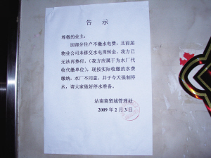 黄先生告诉记者,他去年年初搬进站南商贸城,一直以来,水费都是由物业公司代收,一个季度按水表度数缴纳一次。没想到昨天回家的时候,发现一楼贴着一张物业公司的告示,称住宅区已经停水,停水的原因是部分住户拖欠水费,而且没有水电周转金,具体什么时候恢复供水还不清楚。“我们都按规定缴纳了水费,即使有部分人没有缴纳,也不应该牵连到我们啊!”在站南商贸城6幢,黄先生气不打一处来,黄先生告诉记者,正月都还没过完家里就停了水,要知道温州有吃新年酒的习惯,停水就意味着不能在家中操办新年酒,如此一来,不仅正常生活受到影响,还要丢面子。