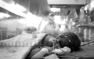 躺在病床上,望着天花板,小锦豪显得十分孤单。 倪华初 摄