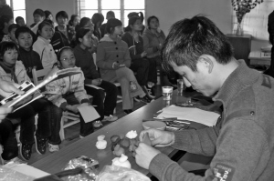 而轮到叶强丛讲述时,现场立即掀起了高潮。原来他带来了他的看家本领,米塑作品——一头金牛。叶老师介绍,叶强丛是该校九一届毕业生,他现是温州米塑第五代传人。叶强丛没有过多介绍自己的经历,一切尽在他的米塑作品中,他带来了一些材料,现场给同学们展示他的手艺。不一会儿,一位栩栩如生的老寿星在他的拿捏下出现了。他说和之前的那头金牛合起来就是“金牛送福”的意思。