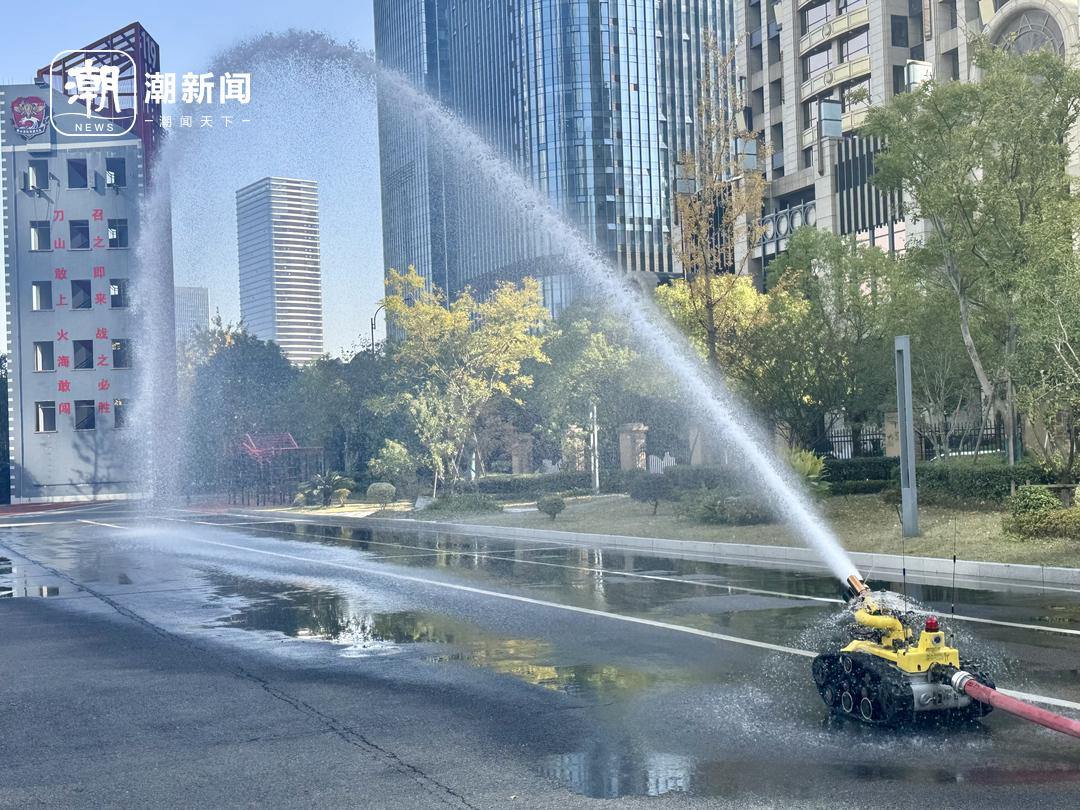 消防灭火机器人开启灭火和自主喷淋功能。记者 陆斯超 摄