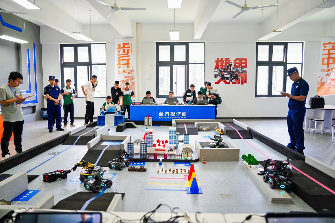 在挑战赛项目之一的“空地一体”消防城市救援赛中,我们看到,比赛搭建了一块模拟高层建筑火灾的城市沙盘,由空中、地面消防作战单元及作战指挥中心构成,选手操控机器人完成“火场”侦察、灭火任务。“没想到能和机器人一起切磋技术,有种从科幻世界走进现实的惊喜。”衢州市常山县实验中学战队的参赛队员马宇航说。