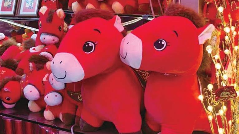 记者注意到,今年各家年货店的“C位”基本上被前段时间爆火的“哭哭马”“笑笑马”和各种含有马元素的公仔占领。从经典的中国红到亮眼的紫、蓝配色,从小巧玲珑的钥匙扣到半人高的大号公仔,造型也是五花八门:有的顶着马毛发髻憨态可掬,有的印着“马到功成”“马上有钱”的讨喜文字,还有手工编织的布艺小马,精致又可爱。