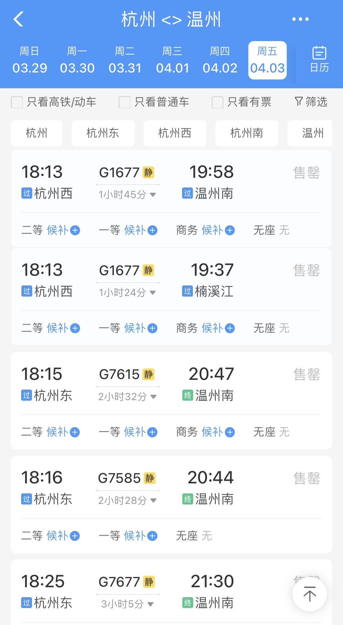 相比之下,当天杭州出发去往省内温州、宁波、金华等地,傍晚5点半之后的车票较为紧张,傍晚6点以后的车票基本全部售罄。