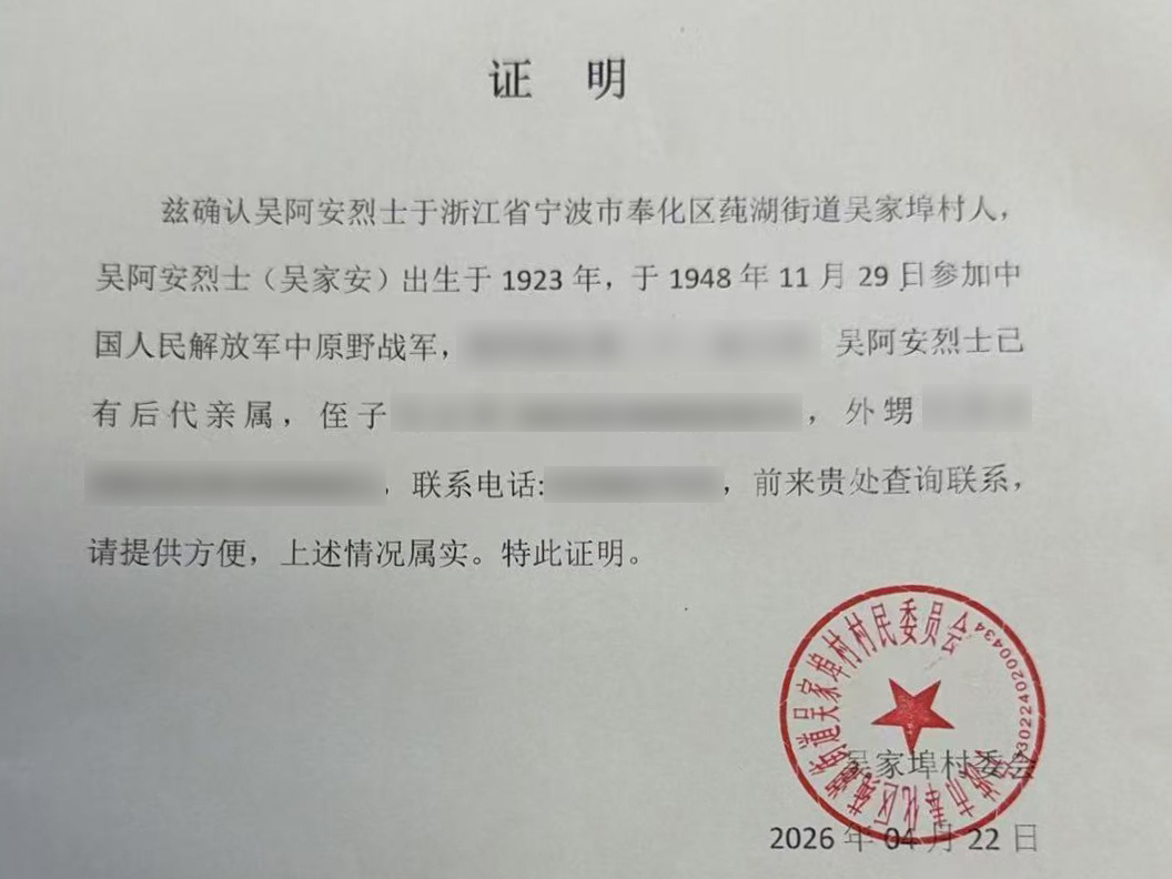 安葬于安徽的奉化籍烈士吴家安,在宁波辅警朱宏伟的不懈奔走下,寻得了血脉亲人。