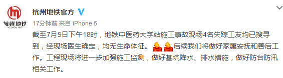 下午6点,记者向杭州地铁集团核实,4名失踪工人先后被救出,但已无生命体征。