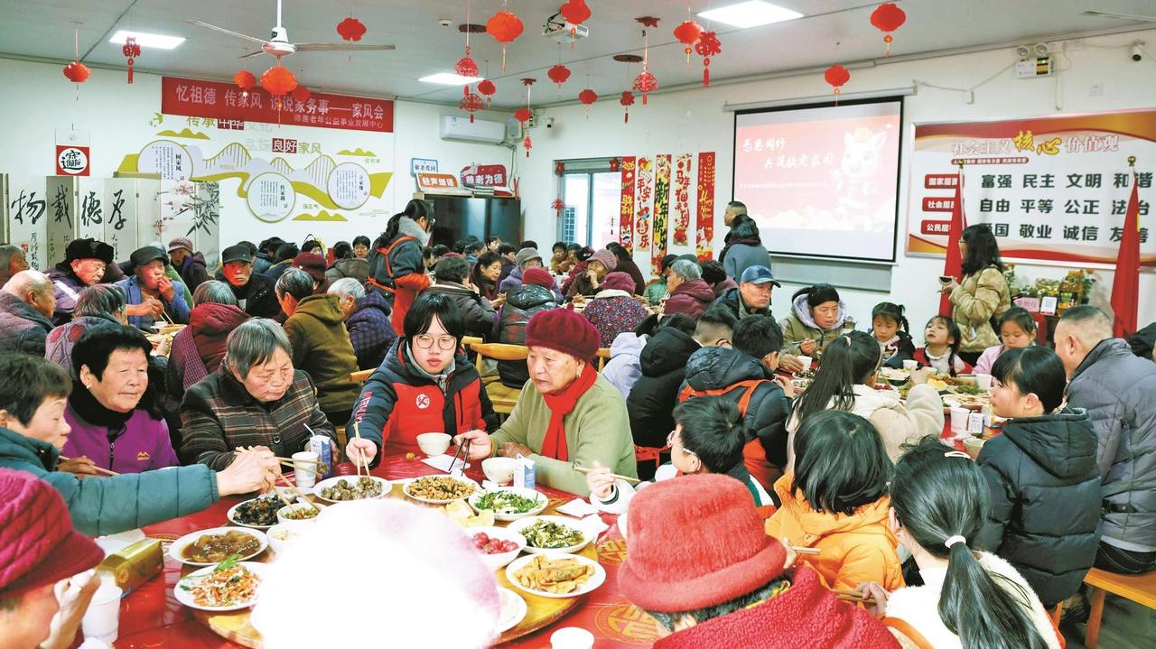 80位高龄老人、独居老人陆续到来,围坐一堂。桌上18道菜,全是地道的宁波老底子味道。这也是他们连续四年,提前吃上一顿免费的爱心年夜饭。