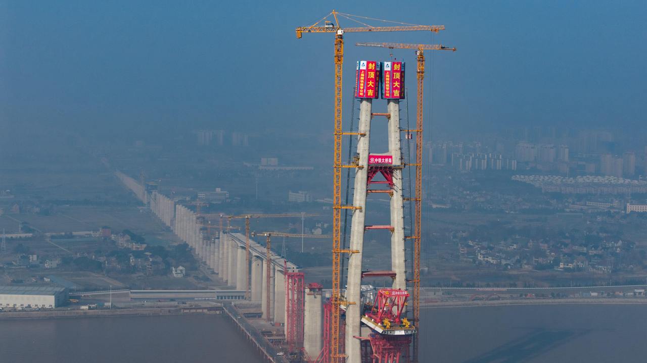 在杭州湾海盐侧离岸0.4公里的海面上,由上海国铁建管公司建设管理、中铁大桥局承建的北航道桥高达200米的8号主塔成功封顶。
