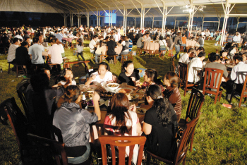 傍晚5点半,一边是千人宴开席,一边是烹饪大赛开始,游客们在品尝美味农家菜的同时,也欣赏着掌勺高手们的技艺大比拼。本次参赛的农家酒店来自瓯海泽雅、仙岩等地共计20家,他们分别把自己的“拿手绝活”带到了比赛现场,食材均为绿色无污染的乡土原料,如本地鸡、水库鱼头、本地猪脚、野生溪鳗等,烧法则是最原始的土烧。