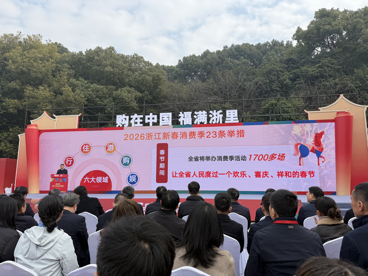 启动仪式现场发布了2026新春消费季系列举措,围绕吃、住、行、游、购、娱6大领域,浙江将推出系列举措。聚焦“马上品年味”,浙江推出浙江“好味道”,举办“味美浙江”系列美食市集、美食家宴、美食地图等活动,支持餐饮企业推出年夜饭让利活动,发布10条“美食+文旅”精品线路。