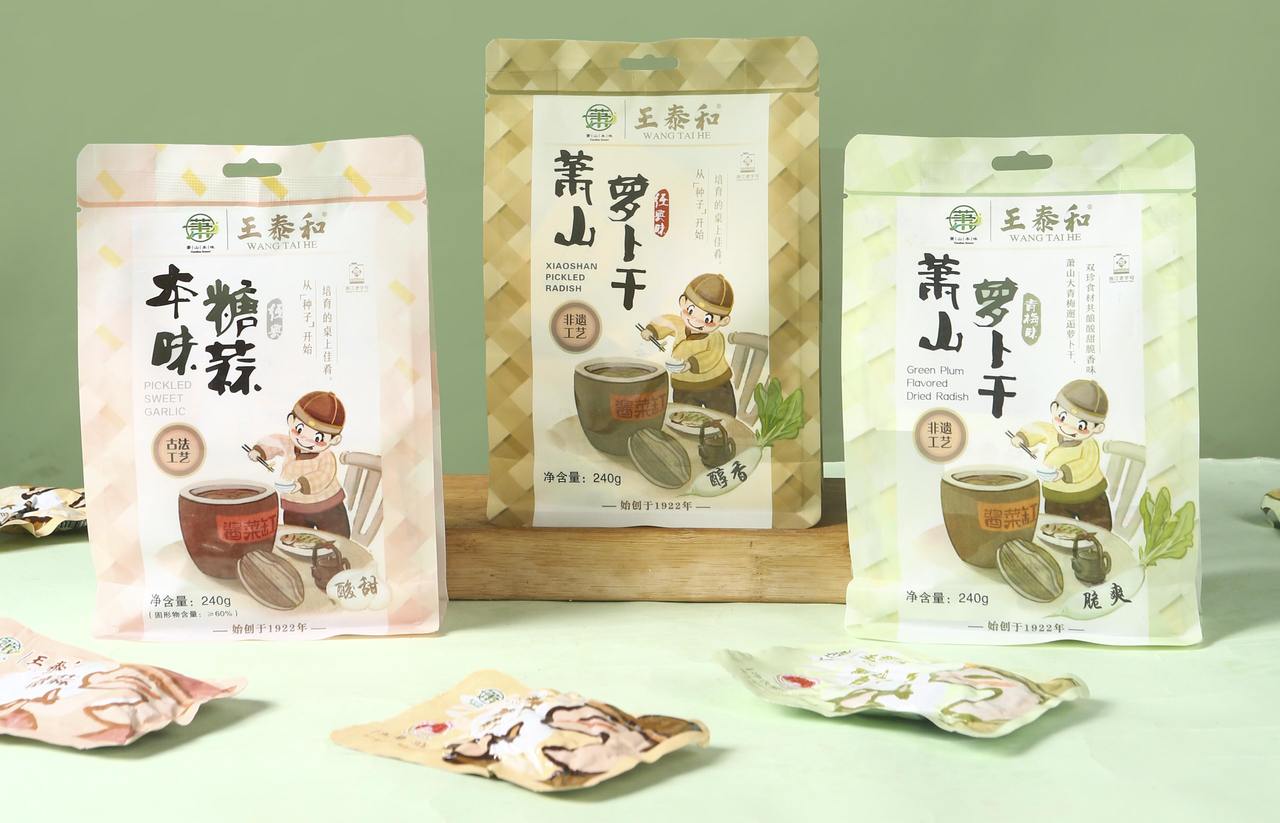 2022年,傅凯莉启动了品牌价值重构计划,作为萧山区仅有的两家具备非遗资质的企业之一,“王泰和”的这次革新,为整个行业带来了新风。她邀请中国美院的设计师,将业内普遍使用的简单包装率先革新为国风礼盒与便携小袋,这一举措在当时萧山萝卜干企业中独树一帜;同时,她敏锐地捕捉到健康潮流,推出减盐配方;又巧妙融合萧山另一地标产品——萧山大青梅,研发出添加了青梅汁的风味萝卜干;企业还自主研发了用于切条、翻缸的机器,提升生产效率。