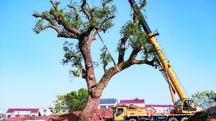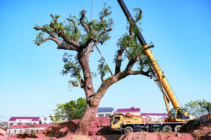 记者在现场看到,为了提高这棵古樟树移植后的成活率,园林工人不断扩大根部土球的尺寸,尽量多保留根系。同时,为了不影响古樟树的姿态,工人减少了对古樟树的修剪。挖出后,古樟树及包装的总重量为86吨左右。