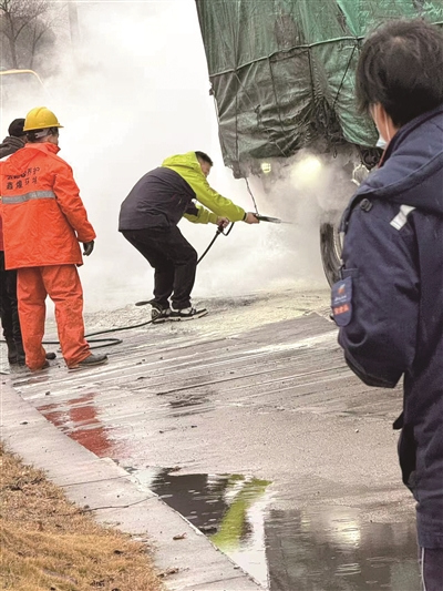 随后,林宽立即举着灭火器对准火源喷射。为了彻底控制火势,他接连使用了4个灭火器,但现场仍有明火残留。幸运的是,就在此时,一辆道路养护车途经现场,驾驶员见状立即停车支援。借助道路养护车上的水枪,约20分钟后,火势终于被彻底扑灭。由于救援及时,货车主体得以保全,避免了整车烧毁及车上货物损毁的重大损失。