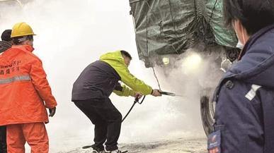 事发时林宽正带着家人驾车经过龙游南高速路口,准备前往六春湖赏雪。行驶至浙江石油加油站附近时,他发现一辆半挂大货车尾部冒着浓烟,货车驾驶员正手持塑料水壶慌张灭火。凭借多年从事拖车行业的经验,林宽瞬间判断情况危急——货车紧邻加油站,一旦火势失控,后果不堪设想。
