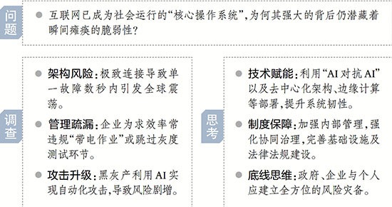 “互联网一直在进步,强大是常态,脆弱是意外。这容易让人忽视它也有‘阿喀琉斯之踵’。”上海财经大学特聘教授胡延平解释,现代互联网分应用、系统、数据、协议、物理五层架构,各层实时联动、环环相扣,既能让信息秒达全球,也会让单一故障在数秒内扩散至全世界。