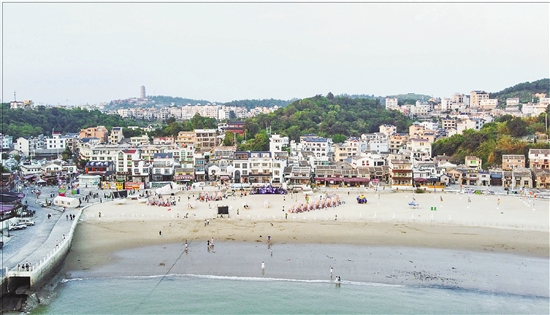 海风拂过闽南风格的街巷,穿过绘着海洋风光墙绘的饭店和民宿群,金色的东岙沙滩跃入眼帘。沙滩排球网、沙滩摩托车以及游艇等游乐设施一应俱全,空气中飘着鱼干晾晒后的鲜香。日前,记者来到位于温州东南端的洞头东岙村,这里也是近年来夏季的热门打卡地。望着不远处形态各异的岛礁,踩在松软的沙滩上,很难想象,十年前这里还是一片碎石滩。