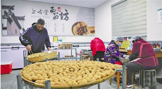 这些日子里,杭州富阳龙门古镇的街巷早已飘起年味儿,家家户户忙着贴春联、备年货,而上古堂面筋坊里更是订单不断,油锅的“滋啦”声、揉面的簌簌声也是不绝于耳。老板娘孙红娟和十几位乡亲围着案板,忙不迭地包面筋、炸面筋,空气中弥漫着面筋外皮的焦香和内馅的鲜香。