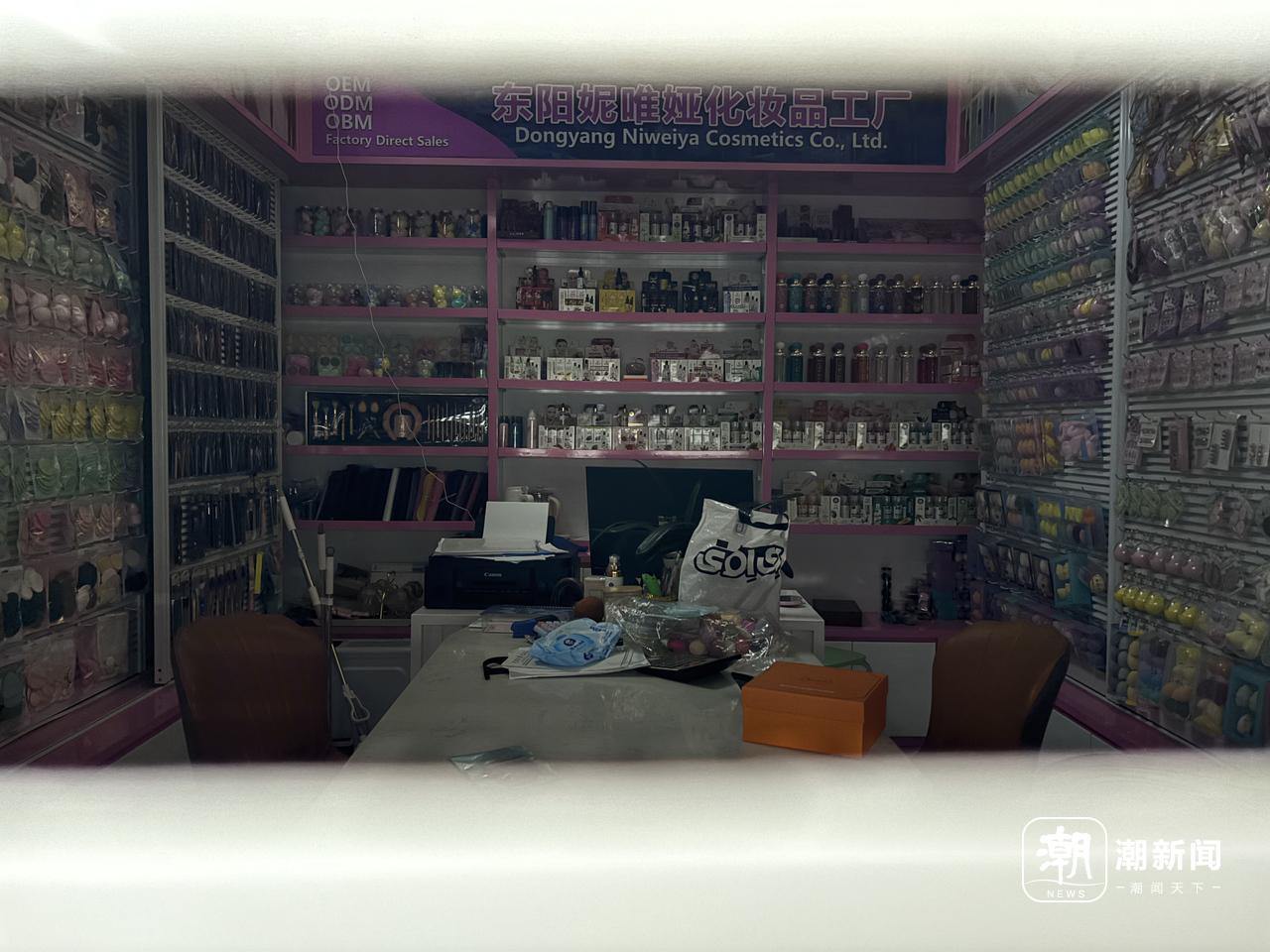 透过卷帘门的缝隙,可以清晰地看到礼萨商铺的货架上,整齐码放着各种化妆品展品。 潮新闻记者 陈黎明 摄