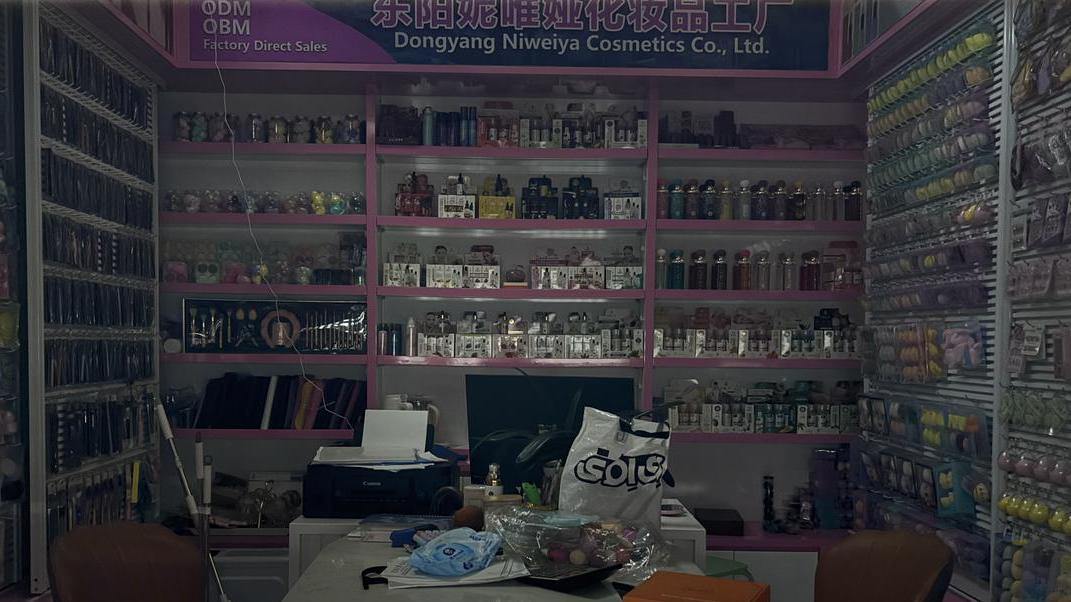 “他年前回国的,但这几天一直看不到他。” 隔壁依灵香水摊位老板娘杨丽敏,指着门店告诉记者。