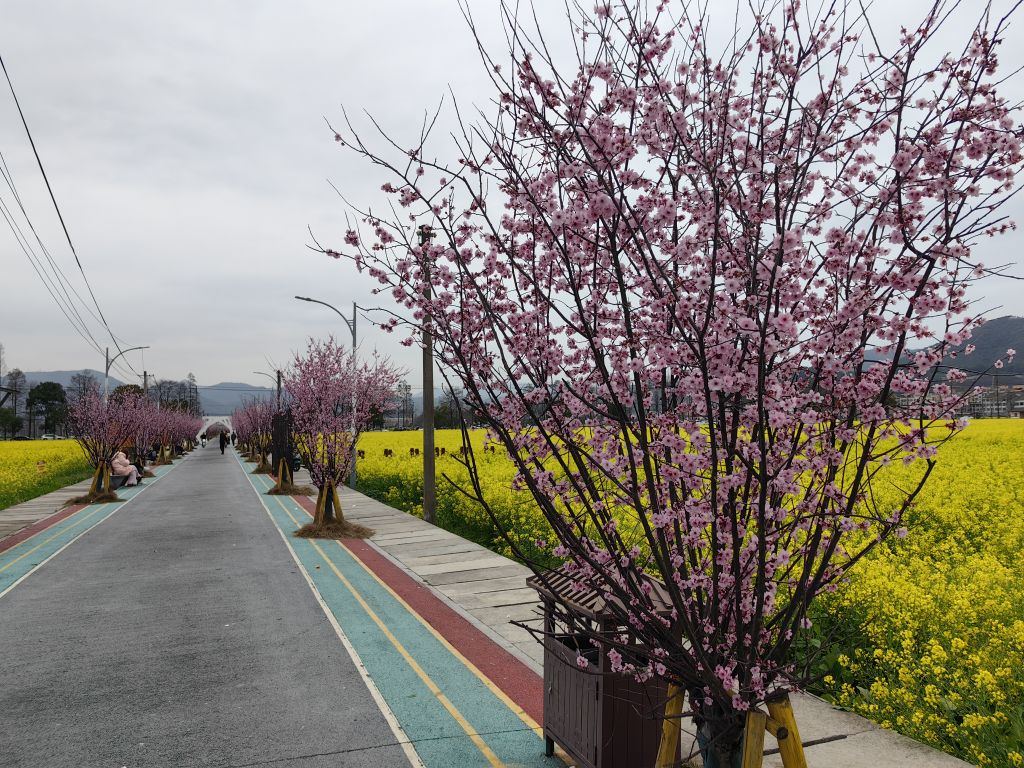 走在仙庄路上,两侧的樱花树像撑开了一把把粉色的伞,阳光透过花瓣洒下来,在地上投下斑驳的光影,道路两侧,是一眼望不到边的油菜花田。粉与黄的碰撞,让这条彩色步道成了春日里最治愈的风景,最适合约上三两好友,慢慢走、慢慢看。