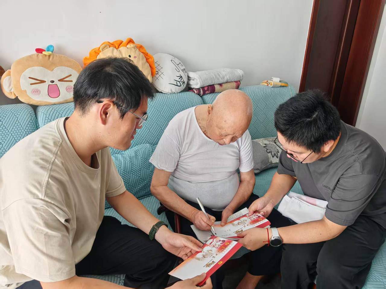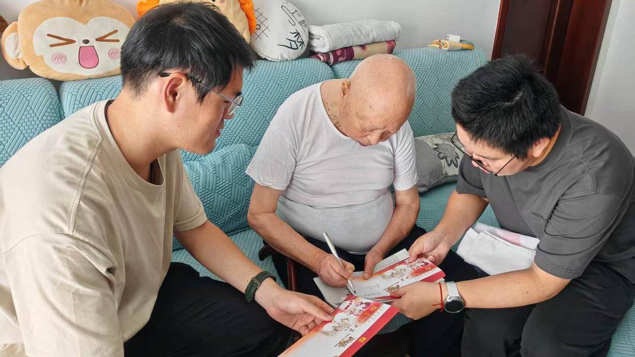 虞仁昌老人生前为两位志愿者签名。受访者供图。