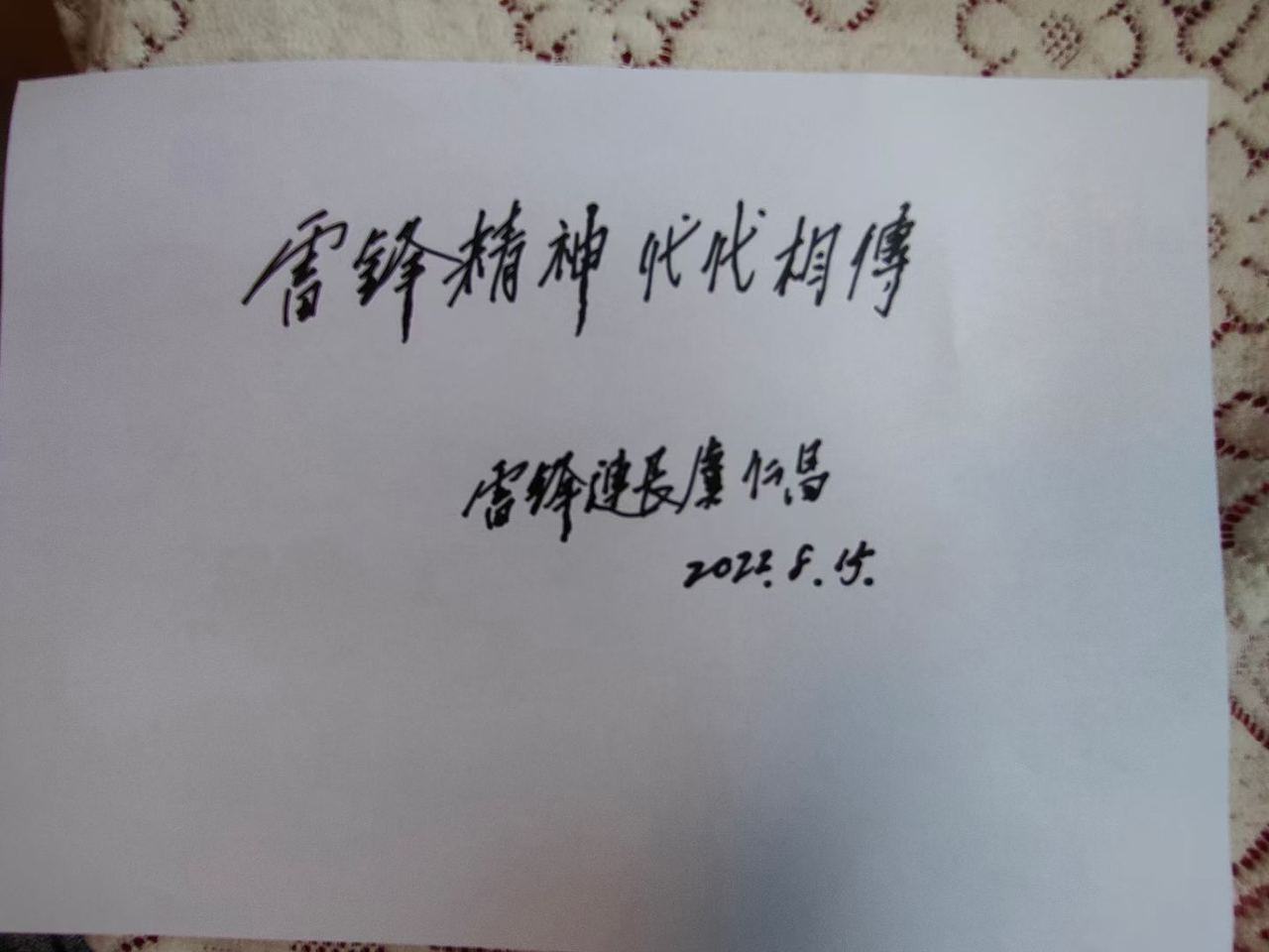虞仁昌为叶庆华题写的字:雷锋精神,代代相传。