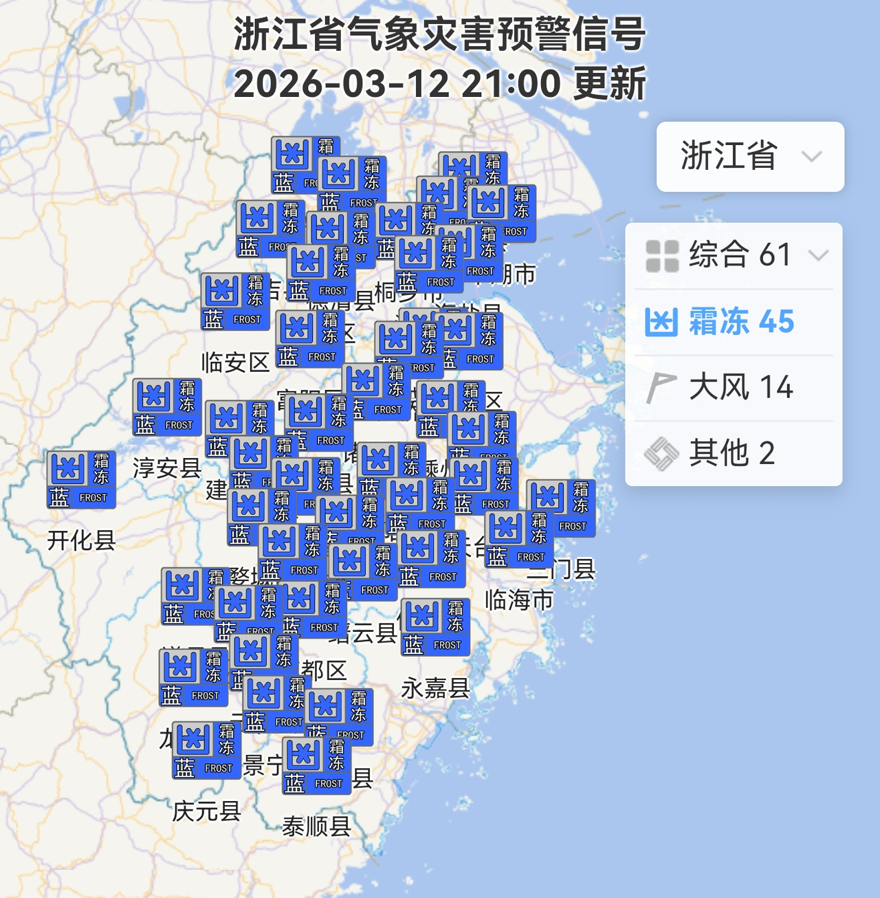 霜冻预警。图源:浙江天气