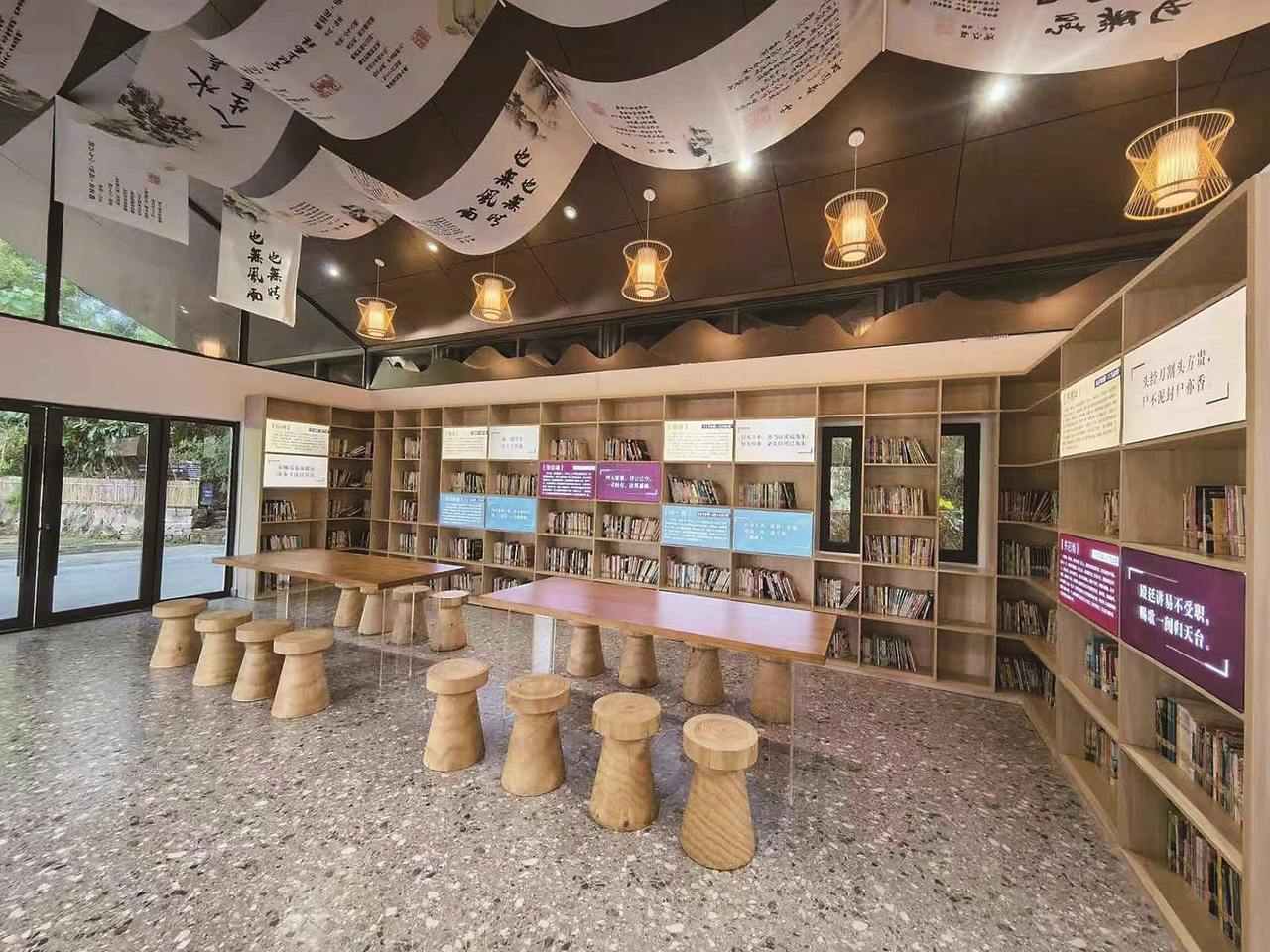作为一个新型阅读空间,始丰书院提供的是充满野趣的阅读体验。阶梯式的建筑风格,将书院分为核心阅读区和露天咖啡区。充足的光线从落地玻璃窗源源不断地洒入室内,读者无论是阅读还是品茶、喝咖啡,抬头即是成片的青绿和天蓝。