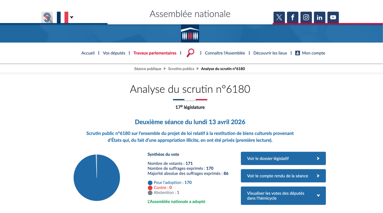 法国国民议会关于文物归还法案投票结果的网页截图。图源:法国国民议会官网