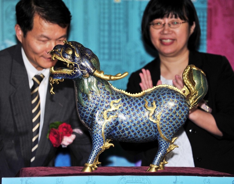 2013年6月在台湾展示的“铜胎掐丝珐琅麒麟”,与被法军从圆明园劫掠、后入藏法国枫丹白露宫的本是一对。令人痛惜的是,枫丹白露收藏的“铜胎掐丝珐琅麒麟”2015年已经被盗,不知所踪。图源:新华社