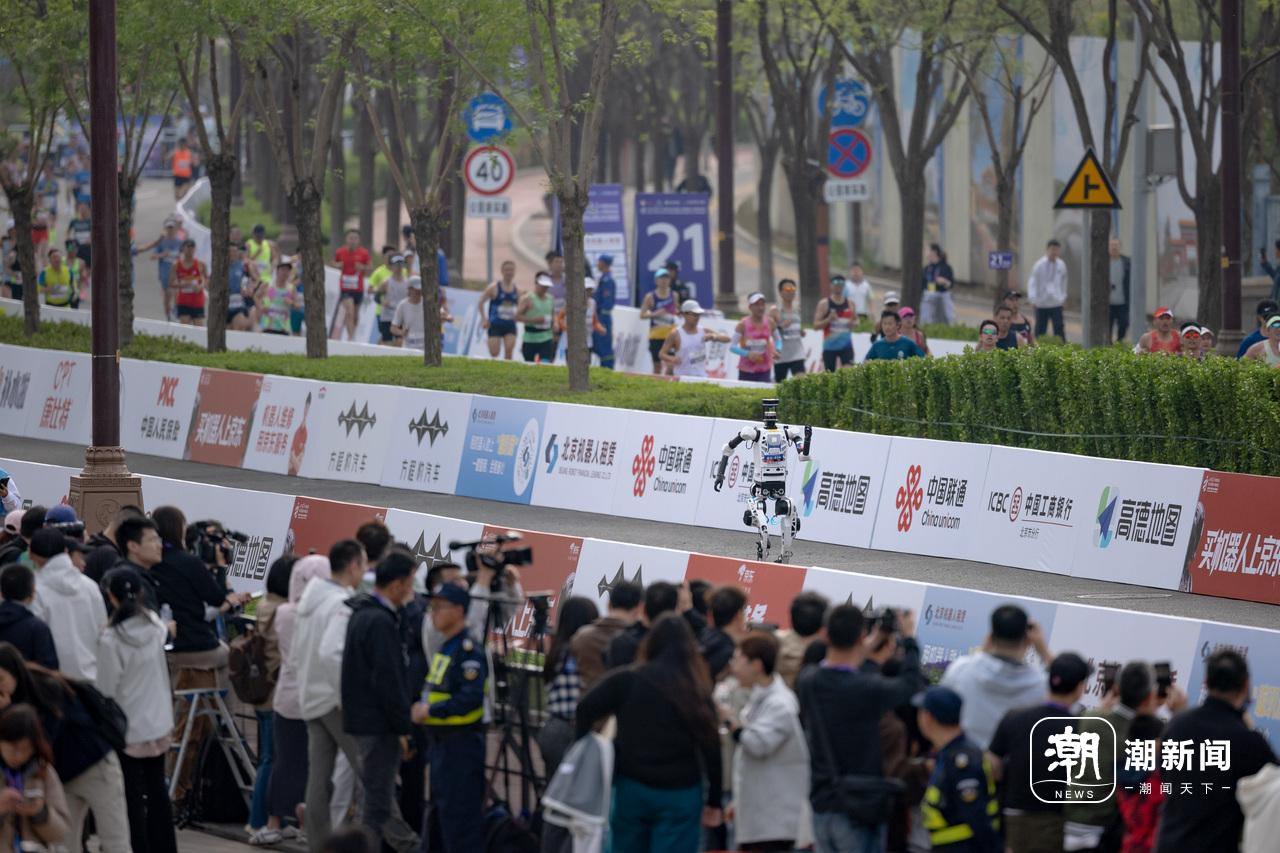 今年反过来了。赛道边有人冲着人类选手喊“加油,超它!”——超的对象是跑在前面的机器人。