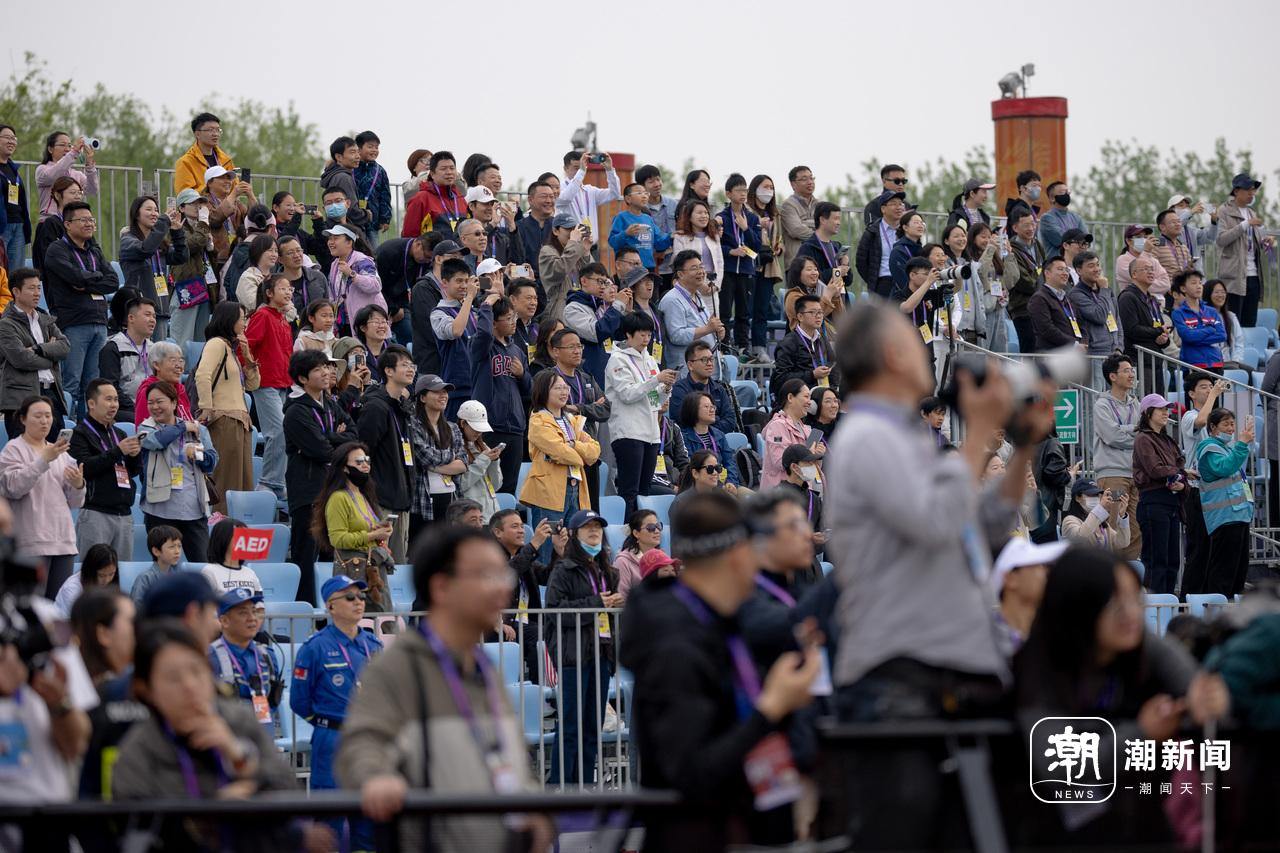 终点线旁的看台上,观众翘首以待第一个冲线的机器人选手。潮新闻记者 倪雁强 摄