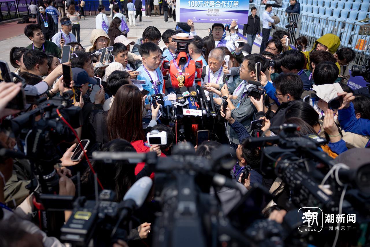 今年7点半鸣枪。记者刚拍完一半的队伍出发,还没走到停车场,工作群就弹出消息:荣耀“闪电”机器人已冲线。开车往终点赶的同行,半路就收到“第一梯队已完赛”。