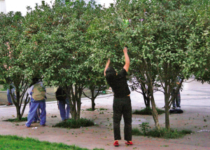 在市区望江西路帆影广场附近,种植了不少桂花树,为了防止市民踩踏草坪,毁坏树木,园林养护人员已经用白色布条将绿化地带圈了起来,可是这里的桂花树依旧难逃“魔爪”。一名姓萧的园林养护工人告诉记者:“这两天桂花开了,就有人来摘了,我们出面制止,他们根本不听。”养护工人说,来摘桂花的,除了淘气的孩子外,还有是早起锻炼的老人,每天早上五六点,他们掀开隔离带,踩着草坪就去折桂花。“前面郭公山路边的桂花都被摘光了,要不是我们每天早上在这儿守着,恐怕有人还会拿木棒来打桂花树。”拾起地上一段被折的桂花枝,园林工人直摇头。
