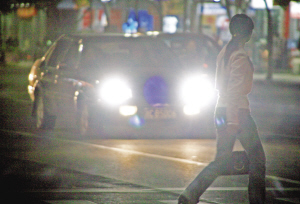 汽车远光灯发出的强烈灯光让过往的行人为之炫目。